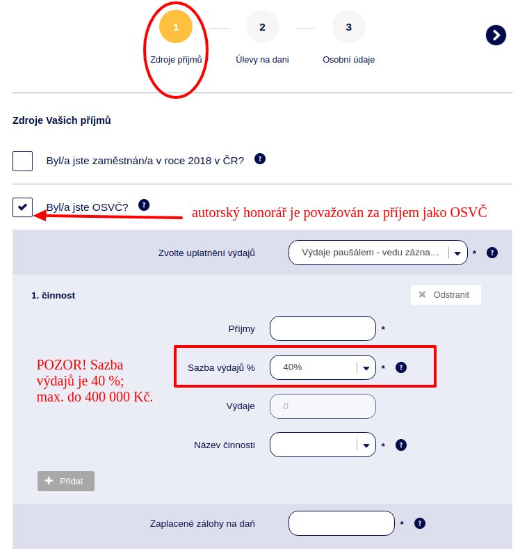 Na konci zdaňovacího období uvedete své příjmy do daňového přiznání a vyúčtujete daň z příjmů. Výdaje uplatníte buď 40% paušálem nebo daňovou evidencí.