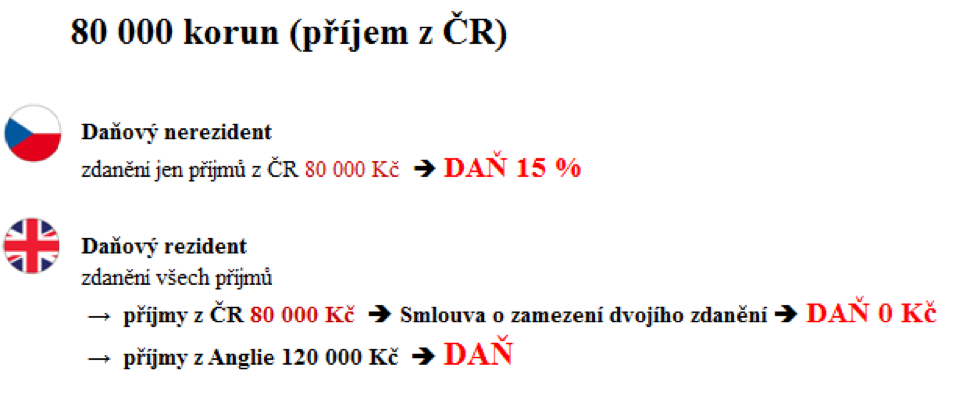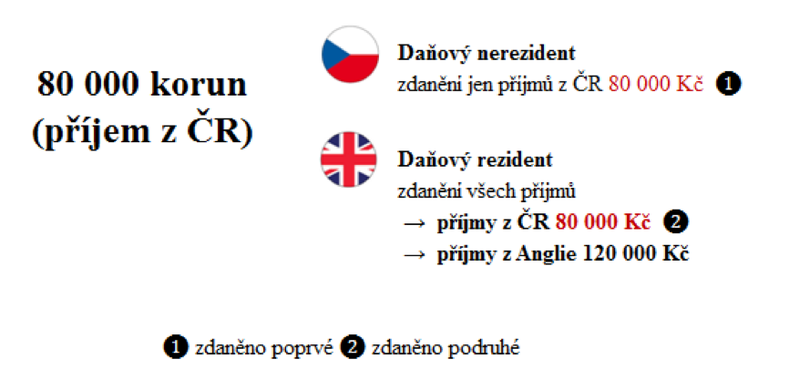 Pokud si Angličan John za 4 měsíce v České republice vydělá 80 00 korun a za 8 měsíců ve Velké Británii 120 00 korun, bude jeho zdanění vypadat následovně. V České republice bude John vystupovat jako cizinec (daňový nerezident) a zdaní tak pouze příjmy, které vydělal v České republice (80 000 korun). Ve Velké Británii, ve své domovině, bude John vystupovat jako daňový rezident a zdaní tak všechny své příjmy (120 000 z Anglie a 80 000 korun z České republiky).