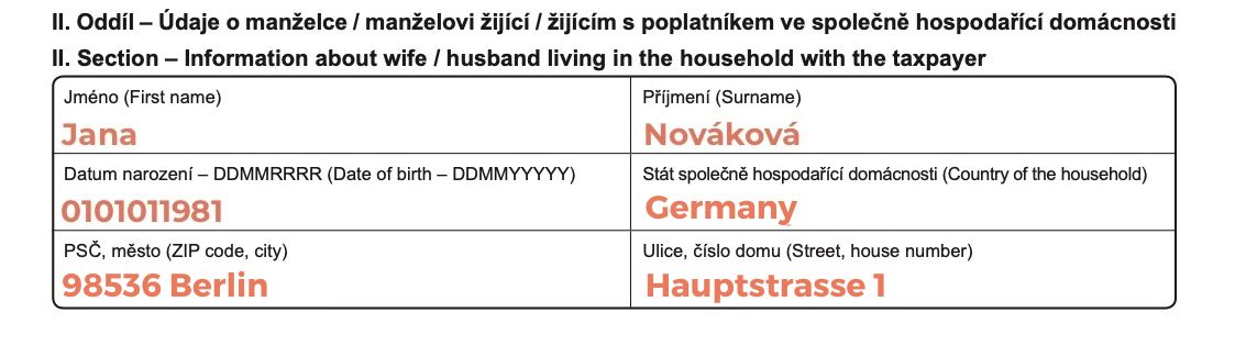 Oddíl II. – V této sekci Hans vyplní údaje o manželce a také její příjem v zahraničí.