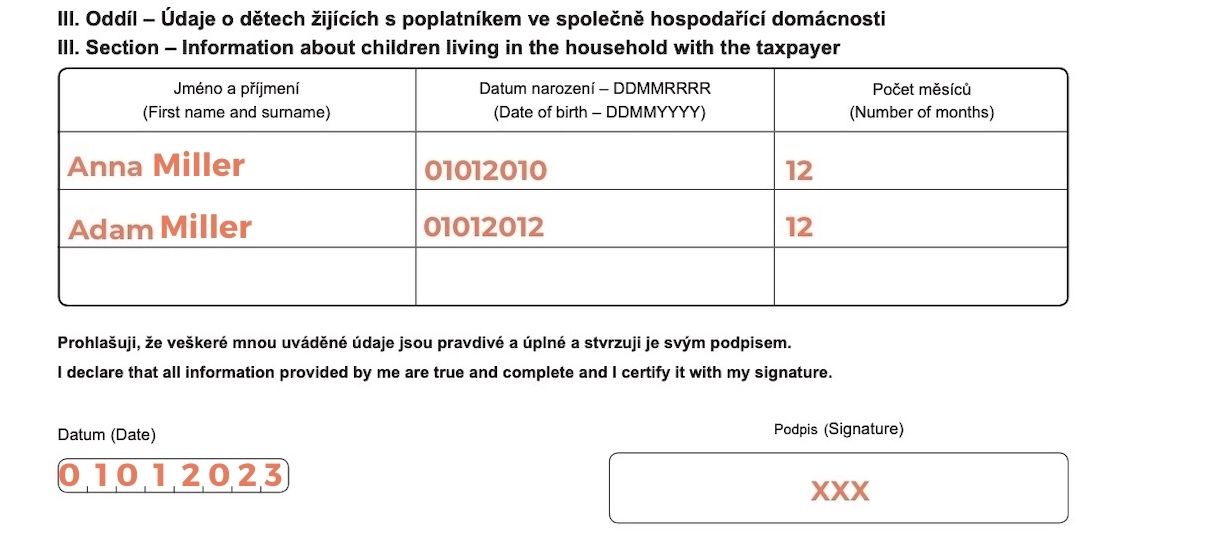 Oddíl III. – V této sekci vyplní Hans informace (jméno, datum narození a délku společného pobytu) o dětech, které s ním žily v jedné domácnosti a za které si žádá slevu na děti, a také podepíše prohlášení o pravdivosti a úplnosti uvedených informací.