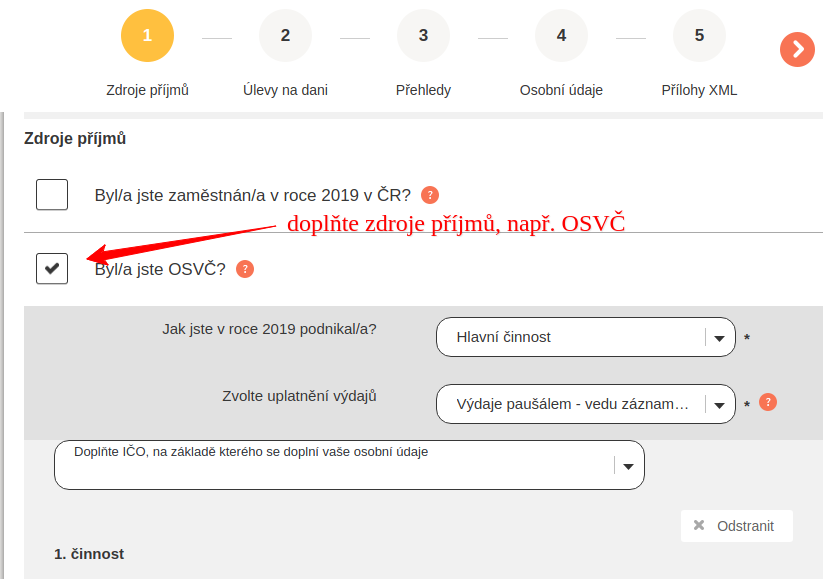 - v aplikaci vyplníte zdroje příjmů např.: podnikání - OSVČ