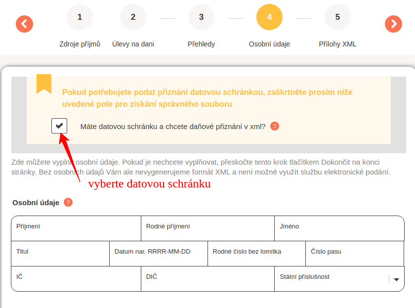 - v kroku 4 vyberte datovou schránku a doplníte osobní údaje
