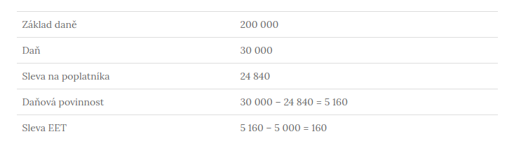 Jsem OSVČ, můj základ daně je 200 000 Kč. 15% daň tedy činí 30 000 Kč. Mohu si uplatnit slevu na poplatníka ve výši 24 840 Kč, a protože jsem musel začít používat EET v roce 2016, mohu si uplatnit slevu na dani ve výši 5 000 Kč. Moje daňová povinnost tedy bude 30 000 – 24840= 5160 -> sleva EET 5160 – 5000 = 160 Kč. Moje daňová povinnost je tedy 160 Kč.