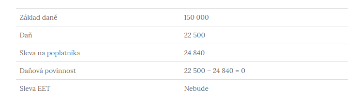 Jsem OSVČ, můj základ daně je 150 000. 15% daň tedy činí 22 500. Mohu si uplatnit slevu na poplatníka ve výši 24 840. Musel jsem letos použít EET a měl bych dostat slevu na dani ve výši 5 000 Kč. Moje daňová povinnost tedy bude: 22 500 – 24 840 Kč = 0. Bohužel si nemohu uplatnit slevu 5000 Kč za první použití EET v roce 2016, protože moje daň po odečtení slevy na poplatníka vychází 0.