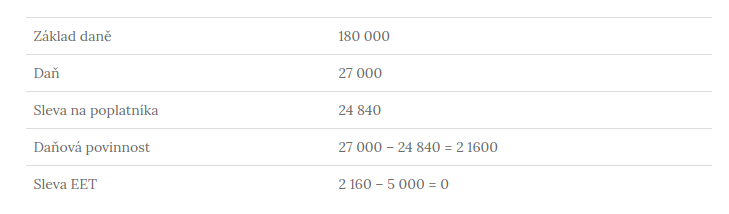 Jsem OSVČ a můj základ daně je 180 000 Kč. 15 % daň tedy činí 27 000 Kč. Mohu si uplatnit slevu na poplatníka ve výši 24 840, a protože jsem musel začít používat EET v roce 2016, mohu si uplatnit slevu ve výši 5 000 Kč. Moje daňová povinnost je tedy 27 000 – 24 840 = 2 160 – 5 000 = 0. Slevu 5 000 Kč mohu uplatnit, ale bohužel nemohu dostat bonus zpět na účet. V mém případě mohu tedy uplatnit slevu pouze ve výši 2 160 Kč a moje daňová povinnost bude 0.
