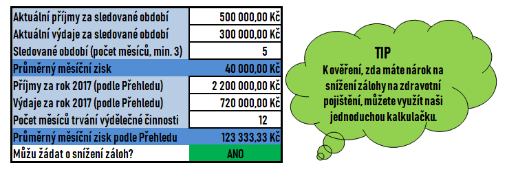 Příklad:Adamovi se v roce 2017 mimořádně dařilo a kromě běžných zakázek se mu povedlo zrealizovat i zakázku za 1 milion korun. Díky zvýšeným příjmům v roce 2017 musí Adam nově platit poměrně vysoké zálohy na zdravotní pojištění. Protože v roce 2018 Adam dosahuje obvyklých příjmů a výdajů (měsíční příjmy 100 000 korun, měsíční výdaje 60 000 korun) a nepředpokládá, že by do konce roku došlo k nějaké významné změně, zvažuje o podání žádosti o snížení záloh na zdravotní pojištění. Má Adam na snížení záloh ze zákona nárok?