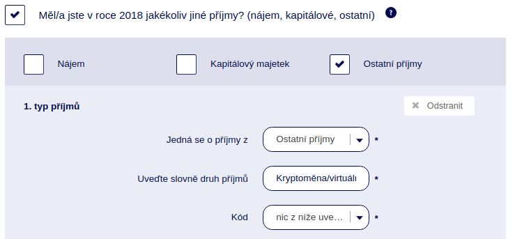 2) varianta se vás týká, pokud zdaňujete tyto příjmy jako podnikatel a v aplikaci doplníte takto: (nebo-li odborněji: na základě podnikatelské činnosti ze samostatné činnosti podle §7 zákona o daních z příjmů, pokud je dosahován podnikatelem ve smlyslu §420 OZ v rámci jeho činnosti bude postupovat jako běžná OSVČ, která má živnost. Dosavadní legislativa zatím neupravuje obchodování s virtuálními měnami, proto se řídí pravidly jako jiné pohyby související s přesuny /koupě, prodej/ s jiným zbožím nebo službami).