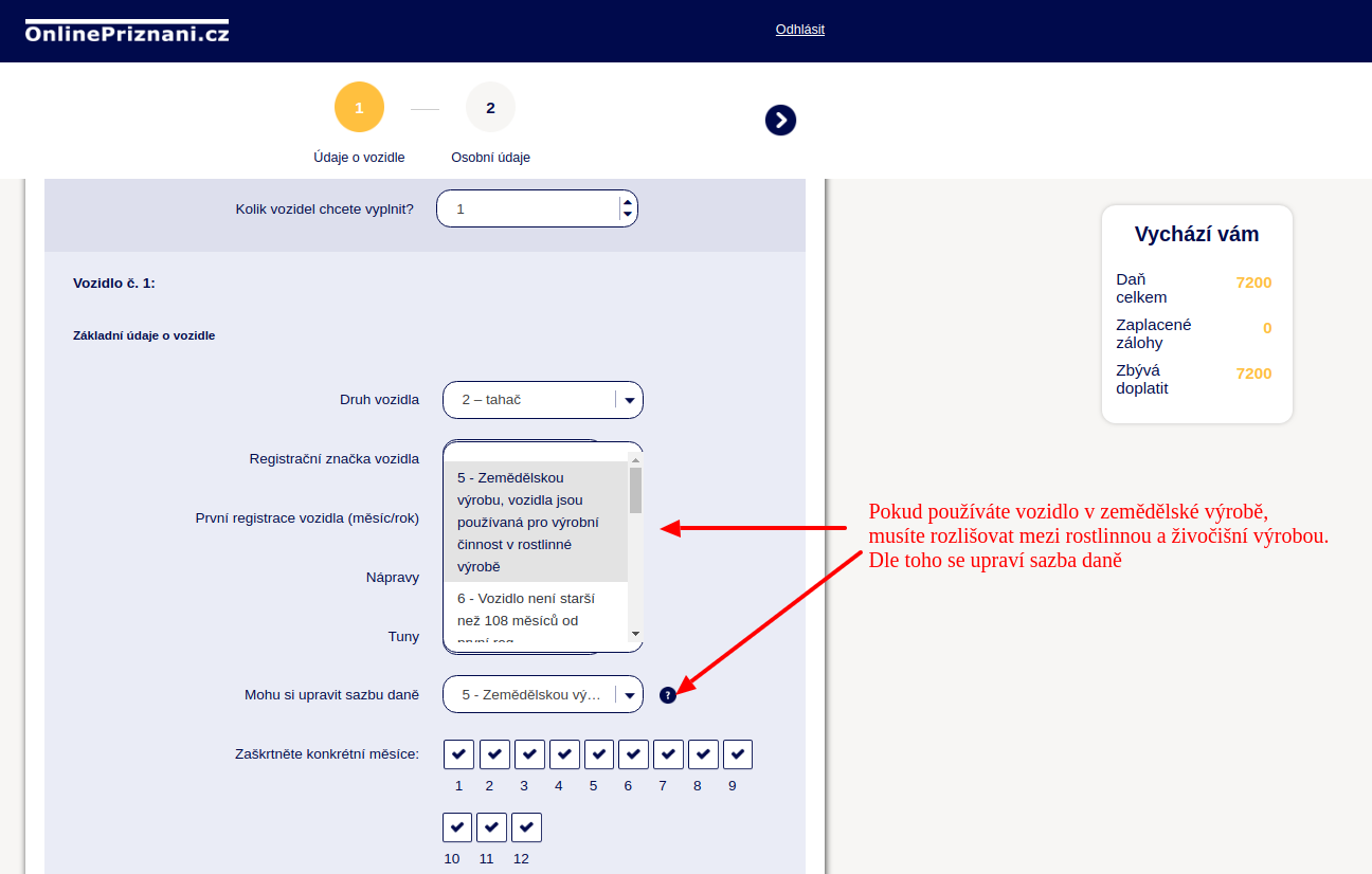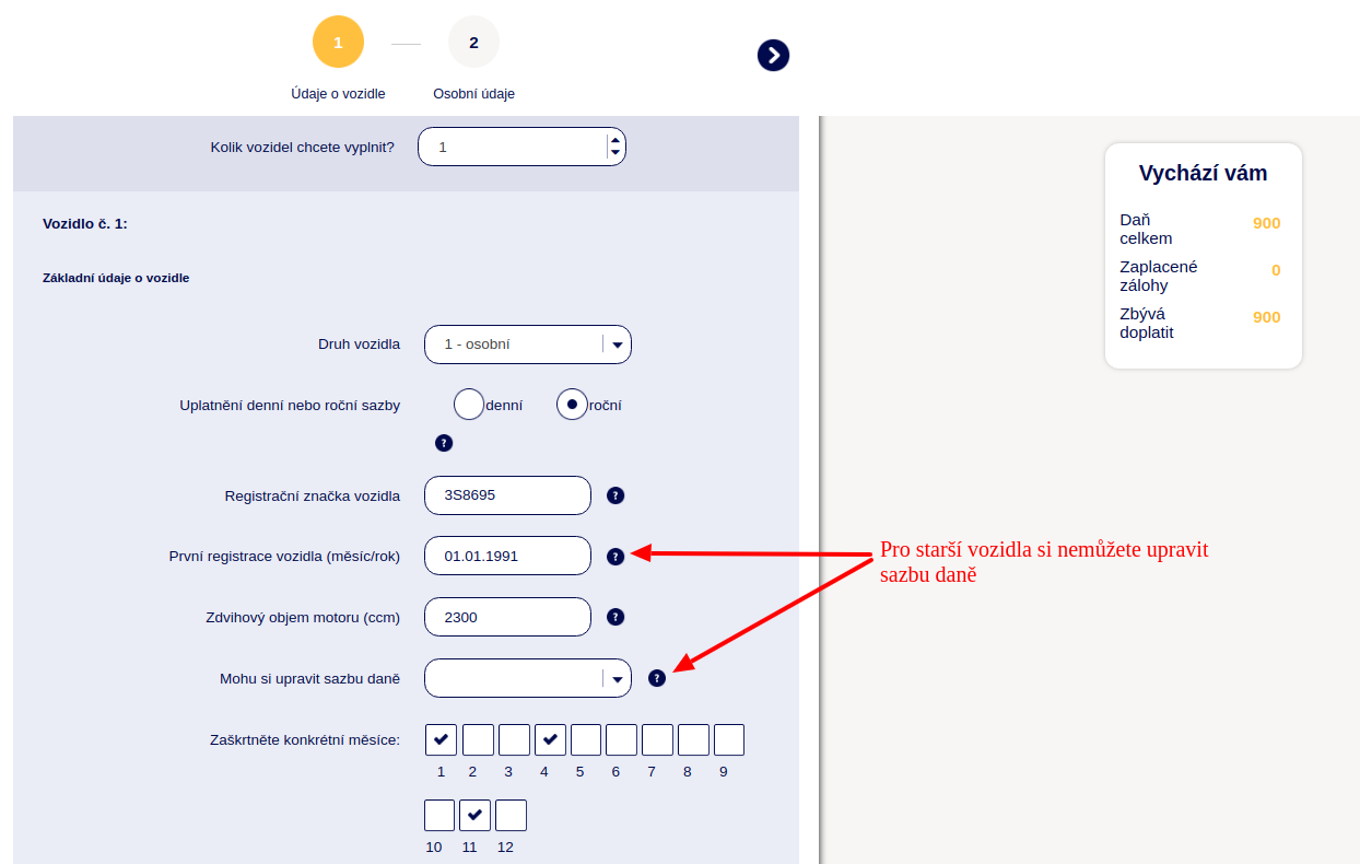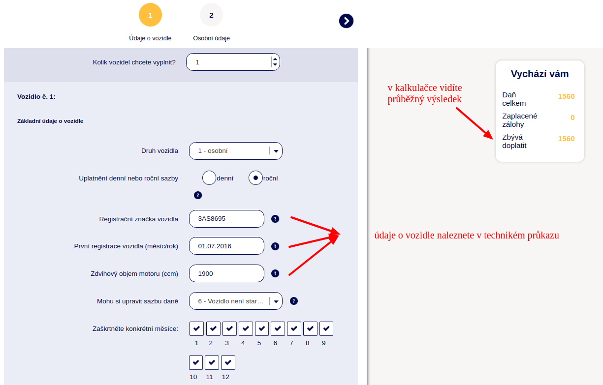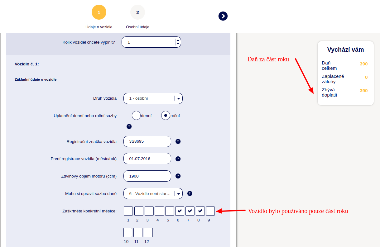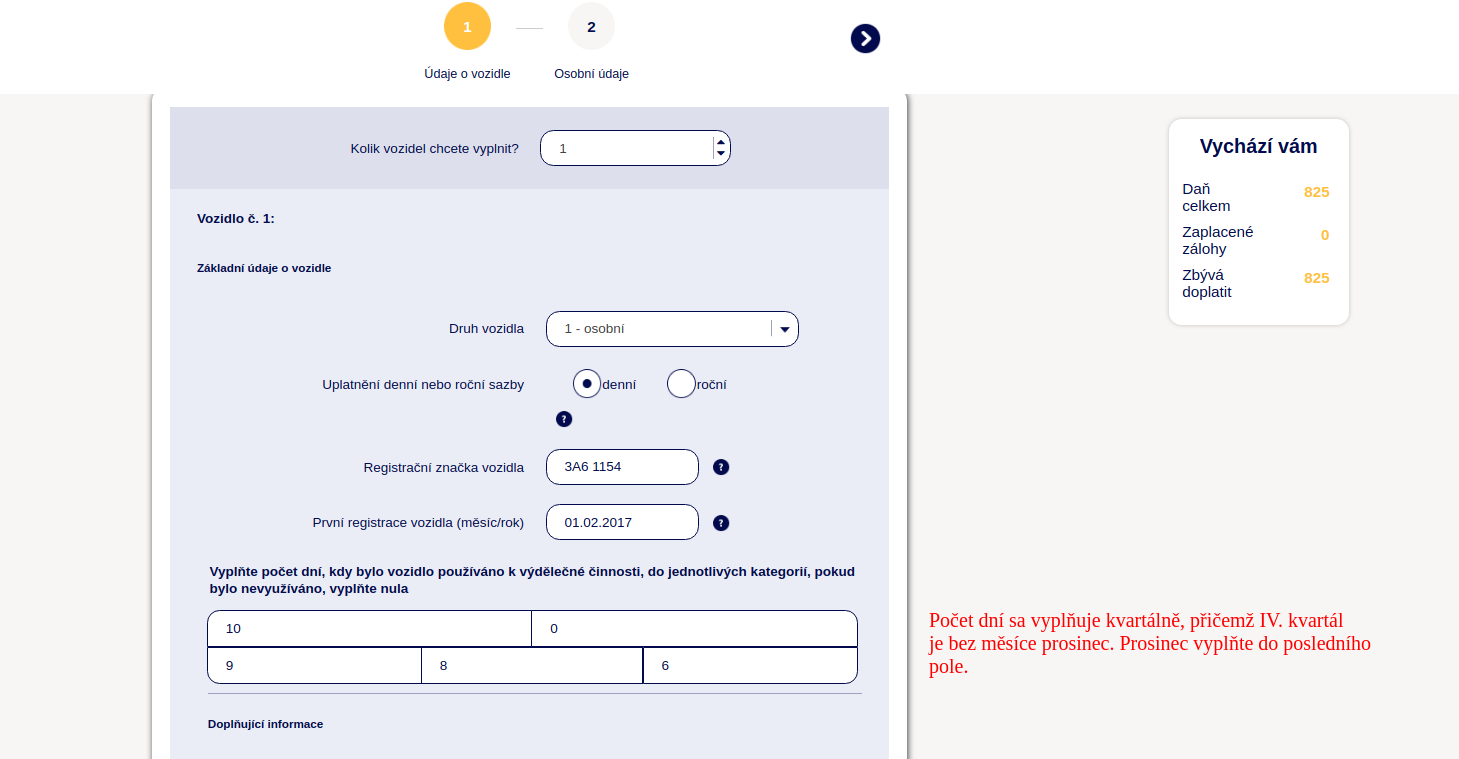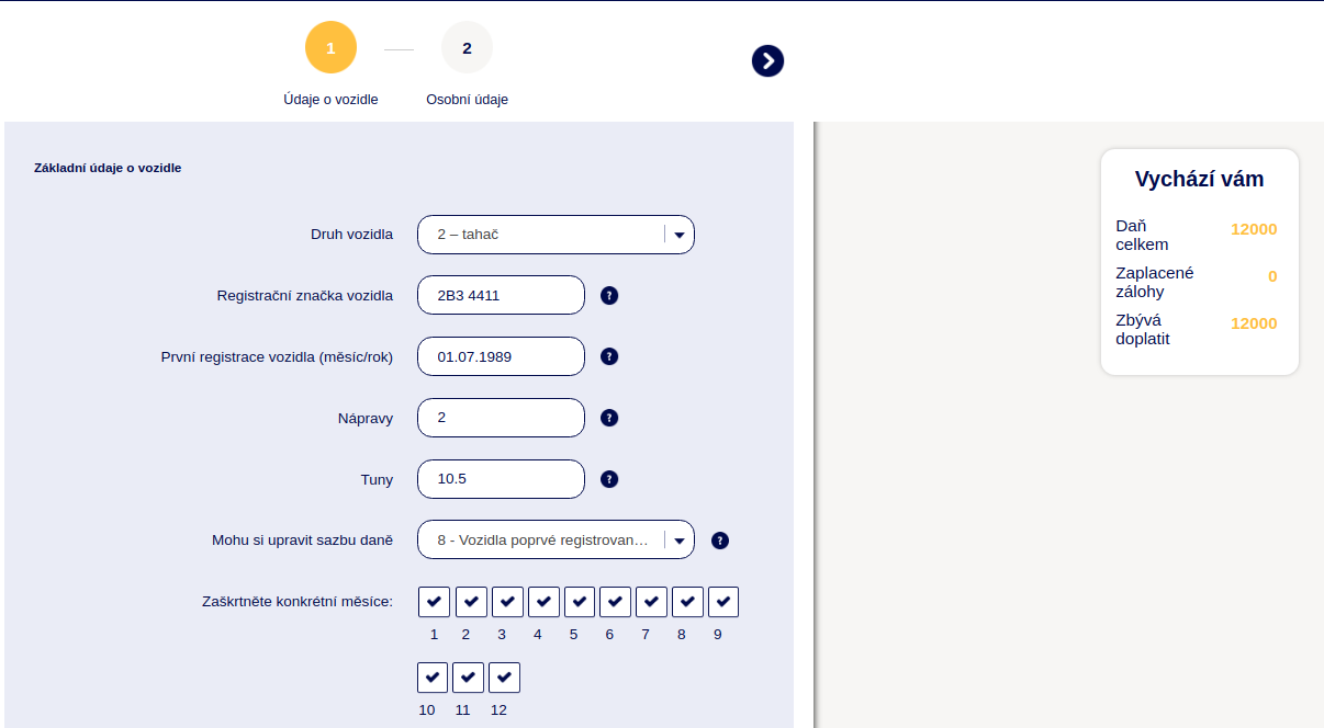 Po přihlášení si přiznání vyplníte jednoduše pouze v 2 krocích. Vyberete počet vozidel, které používáte k podnikání, zvolíte typ vozidla (osobní nebo nákladní auto), vyplníte všechny povinná pole označená červenou hvězdičkou (*). Podle zadaných parametrů vám aplikace sama vypočítá daňovou povinnost. Garantujeme 100% správnost výpočtu.