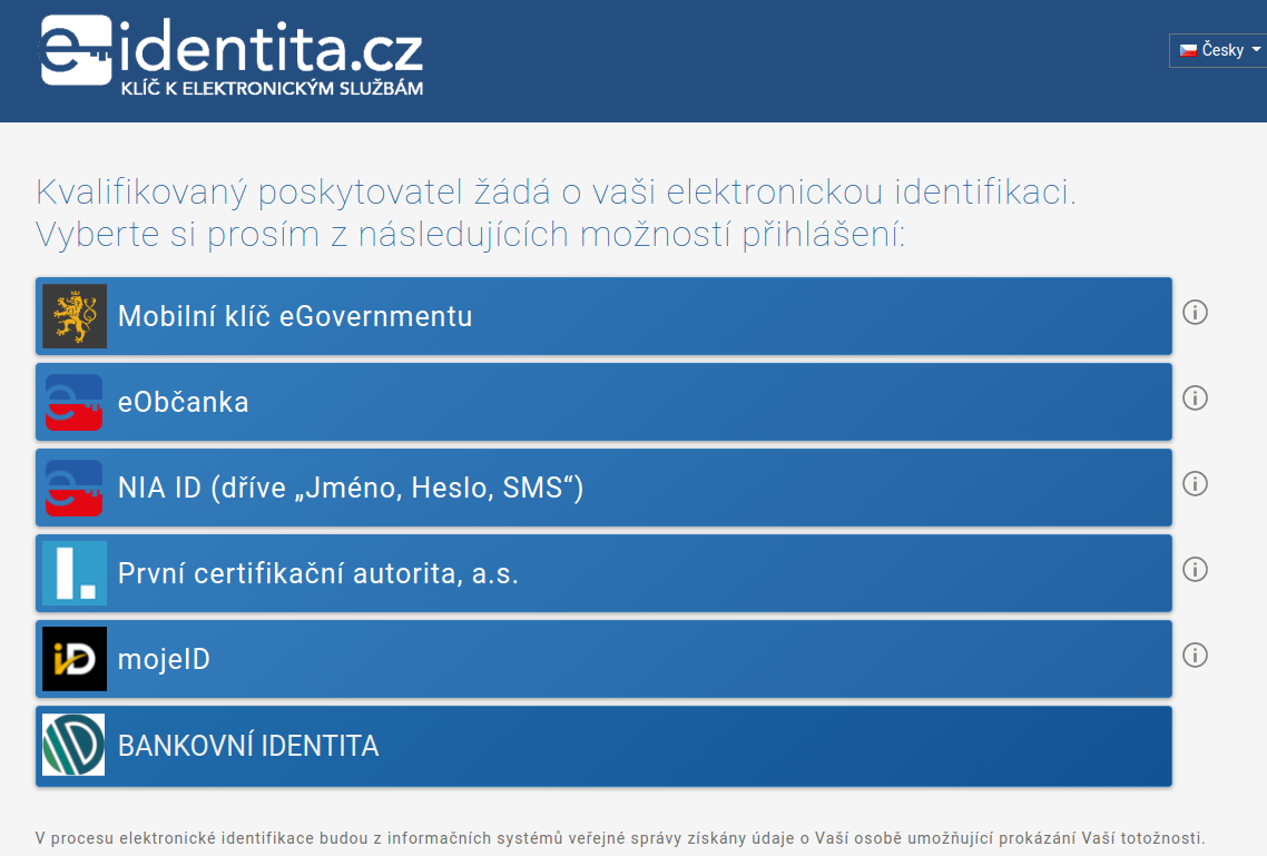 - eIdentitu (mobilní klíč eGovernmentu, eObčanka, NIA ID, bankovní identita, První certifikační autorita a.s., mojeID)