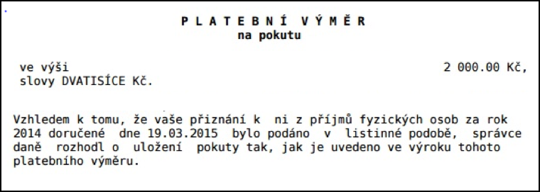 Prvním z nich je pokuta, která je minimálně 500 Kč a musí být vyměřena vždy. Pokuta roste o 0,05 % ze stanovené daně o každý den prodlení. Maximální výše pokuty může být až 300 tisíc korun. Pokuta se platí i za předpokladu, že jako podnikatel dosahujete ztráty. Její výše je opět minimální 500 Kč a roste o 0,01 % ze ztráty za každý den prodlení.