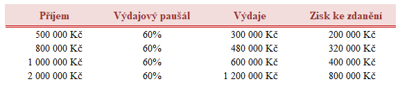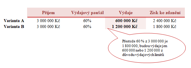 Pokud dosáhnete příjmu 3 000 000 korun, nemůžete si při výdajovém paušálu 60 % uplatnit výdaje ve výši 1 800 000 korun (3 000 000 * 60 % = 1 800 000 korun), ale maximálně v částce 1 200 000 korun (nebo 600 000 korun).