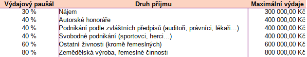 Maximální výdajový limit tedy neznamená, že při vyšších příjmech nemůžete paušální výdaje použít. Naopak. Paušální výdaje je možné použít, jen je omezena maximální výše výdajů.