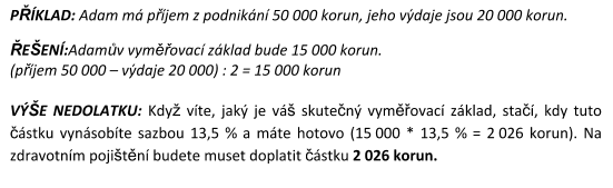 Pokud se Vám nezdá výše nedoplatku na zdravotním pojištění, může si pomocí jednoduchého výpočtu spočítat, zda jste během vyplňování někde neudělali chybu. Částka, kterou budete muset doplatit, se spočítá z VYMĚŘOVACÍHO ZÁKLADU. (Pozor neplést, nejde o minimální vyměřovací základ).