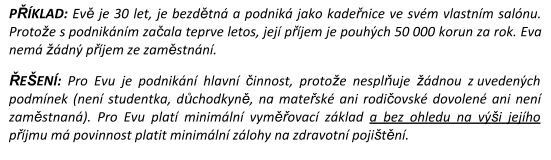 V praxi to pro Vás tedy znamená podstatné. Podnikáte-li na hlavní činnost, každý měsíc státu zaplatíte přibližně 2 000 korun jako příspěvek na zdravotní pojištění. Podnikáte-li na vedlejší činnost, měsíčně státu nebudete platit nic a po podální přehledu doplatíte zdravotní pojištění pouze podle výše vašeho skutečného zisku.