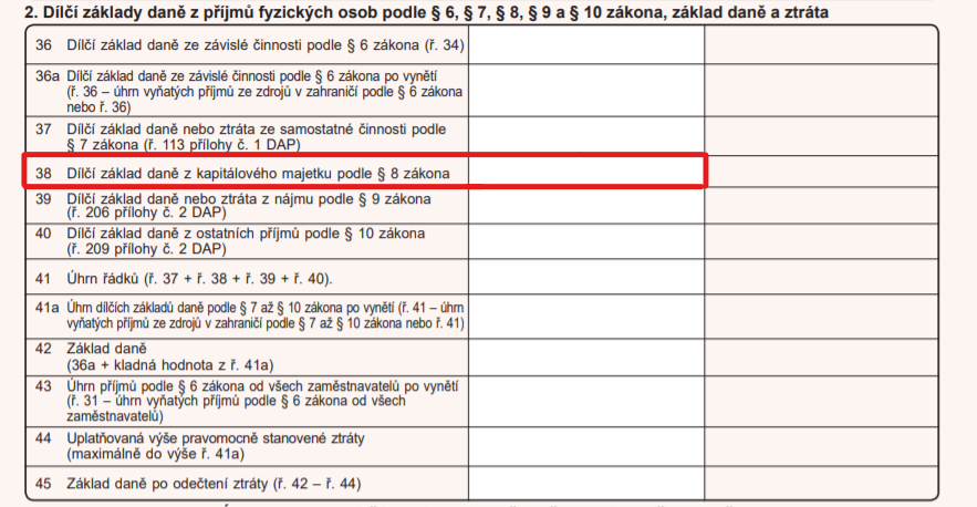 V daňovém přiznání se tento příjem promítne v 2. oddílu na řádku 38 Dílčí základ daně z kapitálového majetku podle § 8 zákona.