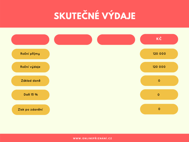 V případě uplatnění skutečných výdajů Adam neplatí žádnou daň, protože daňový základ je nula.