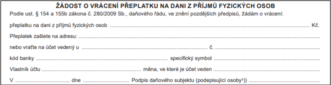 Finanční úřad nevrací přeplatky na dani automaticky. Pro vrácení je proto nutné o něj požádat. Žádost o vrácení přeplatku je součástí tiskopisu daňového přiznání a vyplňuje se na konci formuláře.