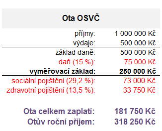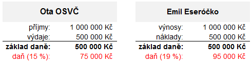 V našich ilustrativních příkladech budeme pro zjednodušení předpokládat, že celkové roční příjmy/výnosy obou našich podnikatelů jsou 1 milion korun a výdaje/daňově uznatelné náklady jsou 500 tisíc korun. Slevy a daňové zvýhodnění zatím nebudeme brát v úvahu (ale nebojte se, nepřijde o ně).