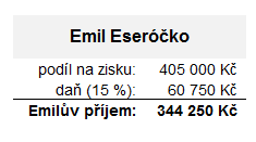 Emilův roční příjem je 185 tisíc korun. Zbylých 405 tisíc korun představuje zisk společnosti. A tady pozor! Tento zisk není na rozdíl od 185 tisíc korun Emila, ale jeho společnosti. Emil si nemůže těchto 405 tisíc korun vzít a použít je na nákup dovolené a nového rodinného auta. Pokud bude chtít Emil vytvořený zisk ze společnosti odčerpat a použít ho pro své soukromé potřeby, musí si nejprve vyplatit podíl na zisku. A světe div se. Podíly na zisku jsou v České republice také zdaňovány. Tentokrát srážkovou daní, která je 15 %. Pokud se tedy Emil rozhodne vyplatit si podíl na zisku ve výši 405 tisíc korun, musí nejprve do státní pokladny odvést dalších 60 tisíc korun.