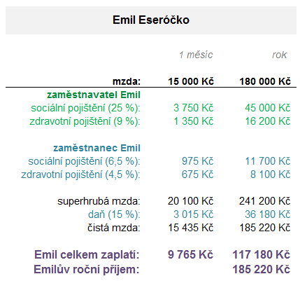 Vycházejme z toho, že je Emil zaměstnancem ve svém eseróčku s měsíční hrubou mzdou 15 000 korun. Povinností každého zaměstnance i jeho zaměstnavatele je přispívat na zdravotní a sociální pojištění. Každý zaměstnavatel za svého zaměstnance odvádí 25 % na sociálním pojištění a 9 % na zdravotním pojištění. Zaměstnanec pak musí zaplatit dalších 6,5 % na sociálním pojištění a 4,5 % na zdravotním pojištění. Protože je Emil zaměstnancem ve své vlastní společnosti, vystupuje jak v roli zaměstnance, tak v roli zaměstnavatele, a proto musí zaplatit jak část pojistného připadající na zaměstnance, tak část pojistného připadající na zaměstnavatele.
