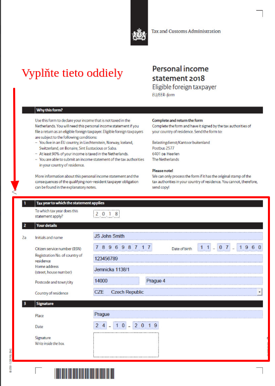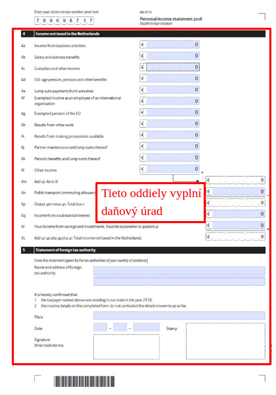 - V časti 2 je „Číslo služby občanom“ BSN/Burgerservicenummer (číslo sociálnych služieb v Holandsku, ktoré nájdete vo svojom Jaaropgave);