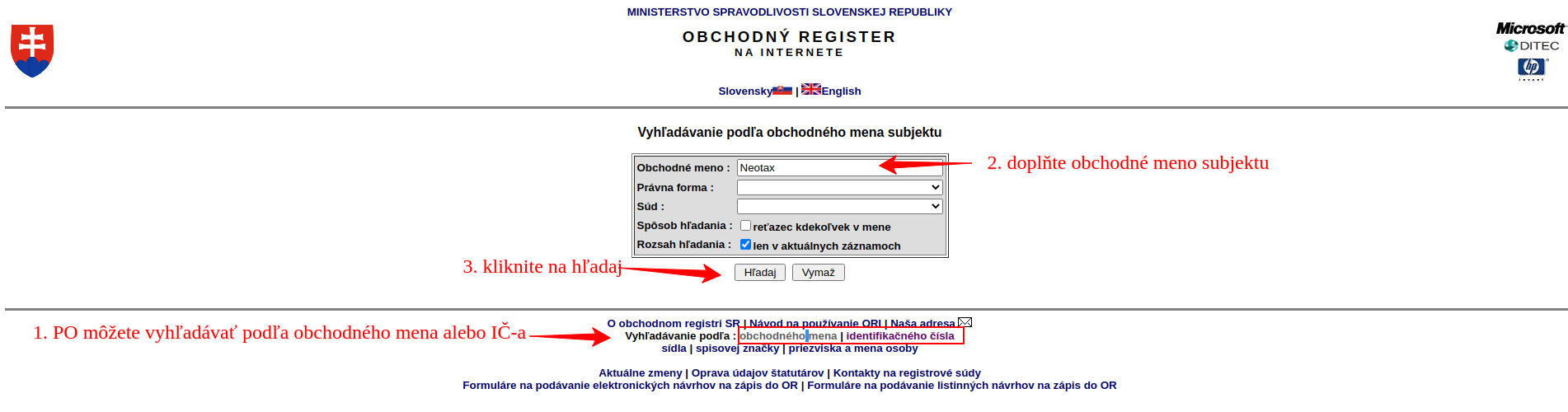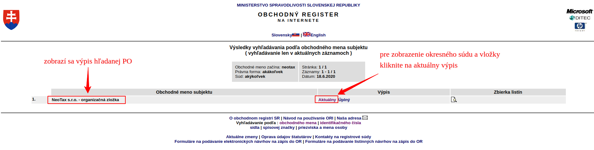 - subjekt môžete vyhľadávať podľa obchodného mena alebo identifikačného čísla, napríklad spoločnosť NeoTax s. r. o.,