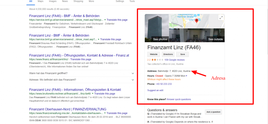 Zadajte tento riadok do vyhľadávača. Na našom príklade je to: „Finanzamt 46“. Google vyhľadal adresu úradu, kam pošlete daňové priznanie. .png)