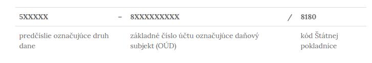 Na úhradu konkrétnej dane (daň z príjmu motorových vozidiel) je nutné si číslo účtu poskladať. Platbu totiž je potrebné previesť na číslo účtu, ktoré sa skladá z predčíslia označujúceho druh dane, nasleduje OÚD a za lomítkom je kód Štátnej pokladnice. Ako bude vyzerať číslo účtu, na ktorý musíte zaplatiť daň z motorového vozidla? Prečíslie je 501163-8XXXXXXXXX/0810. (X nahradíte vlastným OÚD).