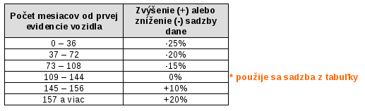 Sadzba dane, uvedená v tabuľke v prílohe vyššie, sa upravuje podľa mesiaca, v ktorom bolo vozidlo evidované (tento údaj nájdete v technickom preukaze v časti II) takto: