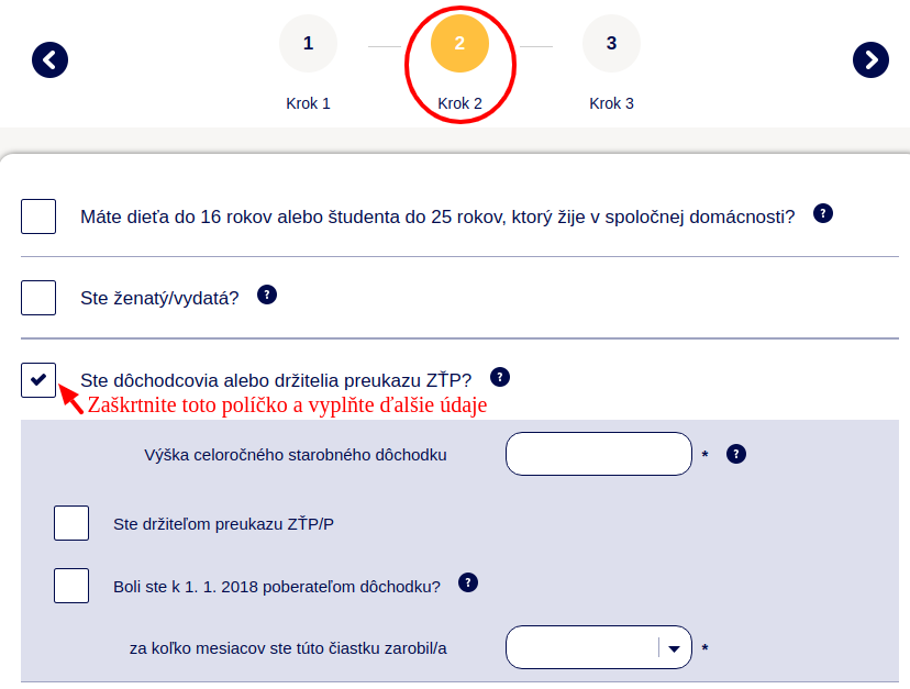 Keďže dôchodok je dávka vyplácaná štátom, nejedná sa o príjem zo závislej činnosti. To znamená, že dôchodok dostanete aj keď nepracujete. V kroku 1 od teraz vyplníte iba príjmy zo zamestnania či podnikania prípadne osobnej asistencie či iné príjmy. Údaje k dôchodku nájdete po novom v kroku 2.