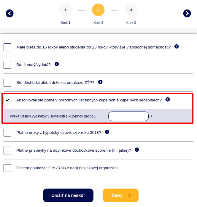 V kroku 2 zaškrtnete políčko Absolvovali ste pobyt v prírodných liečebných kúpeľoch a kúpeľných liečebniach? Aplikácia výšku vašich nákladov odpočíta od základu dane, čo sa prejaví vo výslednej dani.