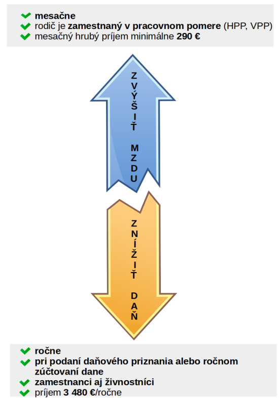 - môže zvýšiť mzdu – mesačne v prípade, že je rodič (daňovník) zamestnaný v pracovnom pomere (hlavnom či vedľajšom), pričom podmienkou je mesačný hrubý príjem minimálne 290 €