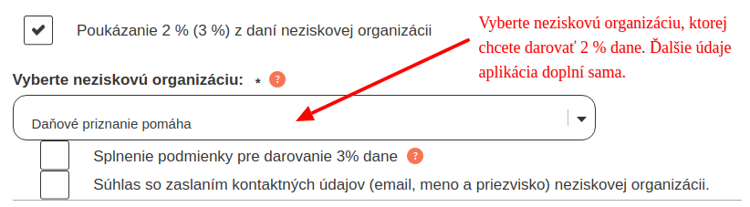 Ak ste si predĺžili podanie daňového priznania napr. do 30. júna a daňové priznanie do tohto dátumu podáte a daň uhradíte, môžete darovať 2 % dane vybranej neziskovej organizácii. 2 % dane môžete v aplikácii poukázať zaškrtnutím oddielu k darovaniu. Potom stačí vybrať neziskovú organizáciu, ktorej chcete darovať svoju časť daní. Ak sa vám oddiel s darovaním 2 % nezobrazil, 2 % dane sú nižšie ako je limit pre darovanie a na darovanie nemáte nárok.