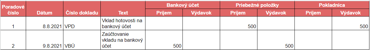 Nasledujúci deň sa vo výpise z bankového účtu objaví transakcia z predchádzajúceho dňa - vklad hotovosti 500 €. Na bankovom účte podnikateľa je príjem 500 €. Podnikateľ na základe výpisu z bankového účtu zaúčtuje 500 € ako príjem na bankový účet. Protistrana bude výdavky na účte priebežné položky. Účet priebežné položky bude „na nule”. Transakcia je týmto úkonom zaúčtovaná a ukončená.