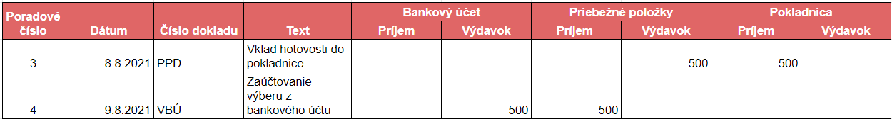 Hotovosť pribudla okamžite vkladom do pokladnice. Na účte pokladnica podnikateľ zaúčtuje 500 € do položky príjmy. Peniaze v banke síce fyzicky nie sú, ale vo výpise z účtu sa výber v ten deň neuskutočnil. Protistrana príjmov v pokladnici budú výdavky na účte priebežné položky.