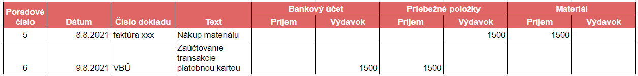 Podnikateľ okamžite získal materiál, peňažné prostriedky mu z bankového účtu strhla banka, avšak vo výpise z bankového účtu táto transakcia ešte nefiguruje. Na účte nákup materiálu tak vznikne príjem 1500 € a na účte priebežné položky vznikne výdavok 1500 €.