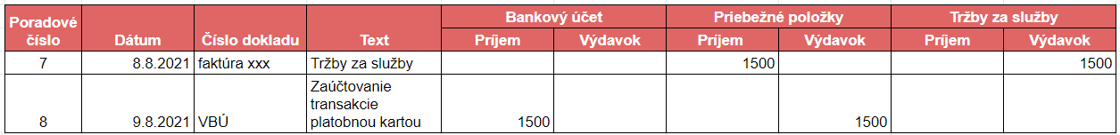 Podnikateľ okamžite poskytol službu, peňažné prostriedky za ňu sa mu pripíšu až nasledujúci deň. Vo výpise z bankového účtu táto transakcia ešte nefiguruje. Na účte služby tak vznikne výdavok 1500 € a na účte priebežné položky vznikne príjem 1500 €.