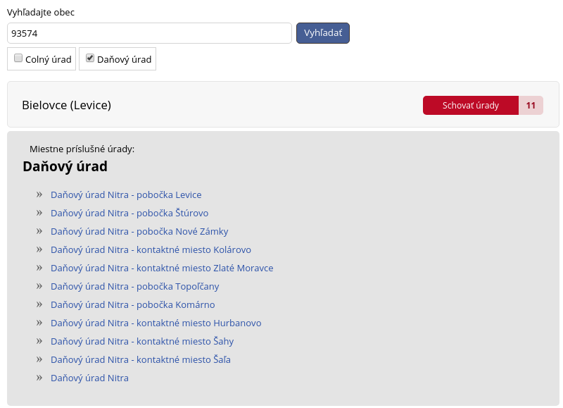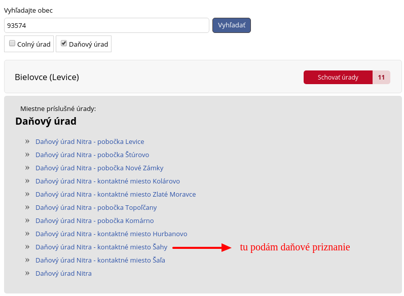 Ak ste napr. z obce Bielovce, ktoré sa nachádza v okrese Levice v Nitrianskom kraji a najbližšie mesto so sídlom daňového úradu sú Šahy, zobrazia sa daňové úrady v Šahách, Leviciach, Nitre, ale aj v Topoľčanoch či Šali. Kam teda podať?