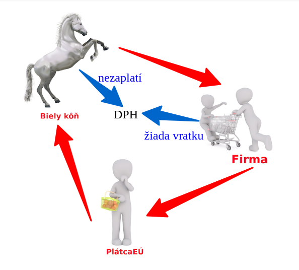 Biely kôň nakúpi počítače za 100 000 €. DPH z tohto obchodu tvorí 20 %. Na kontrolnom výkaze uvedie 20 000 € DPH, ale túto čiastku už daňovému úradu nezaplatí. Počítače predá firme ABC za 120 000 €, pričom firma ABC prizná v kontrolnom hlásení 20 000 € DPH a aj ho zaplatí. Počítače za rovnakú cenu predá ďalej firmy XYZ a takto počítače prejdu 10 firmami. Posledný známy vlastník počítačov ich predá do Čiech za 100 000 €. Keďže ide o cezhraničný obchod, DPH je od dane z pridanej hodnoty oslobodené. Od štátu však žiada vratku na DPH 20 000 €. Štát mu túto vratku vyplatí a firma, ktorá vlastnila počítače ako posledná na Slovensku, ošklbe štátnu pokladnicu o 20 000 €. Štát tak zostane v mínuse, pretože na výstupe DPH odišlo, ale na vstupe do pokladnice nepristálo.
