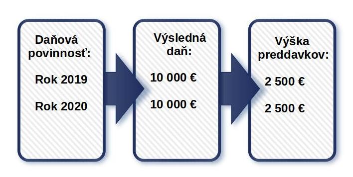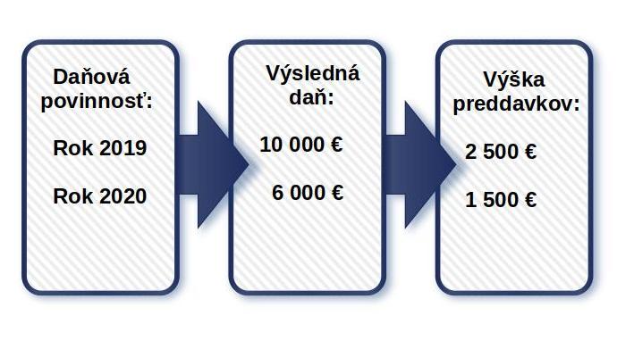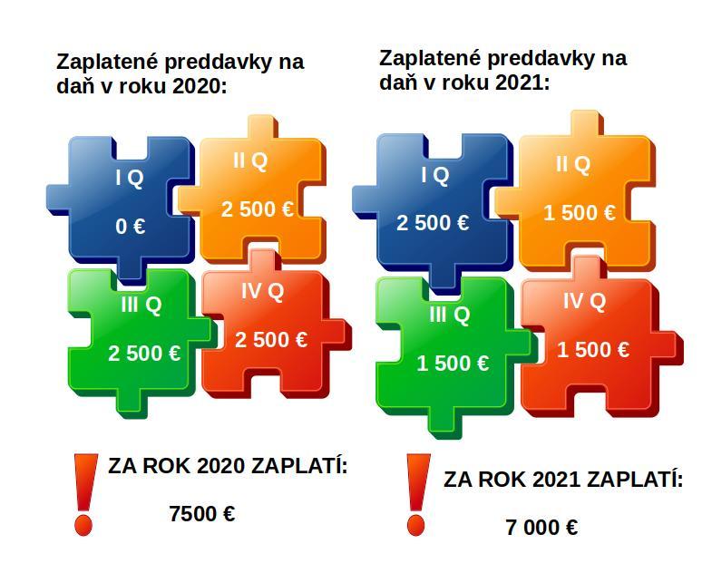 POZNÁMKA: Keď bude mať Mária v roku 2021 rovnaké príjmy ako v roku 2019 a 2020 a jej výsledná daňová povinnosť bude 10 000 €, po odpočítaní preddavkov na daň jej vyjde v daňovom priznaní za rok 2021 podanom v marci 2022 nulová daň k úhrade, pričom zálohy na daň bude musieť ďalej hradiť v nezmenenej výške.
