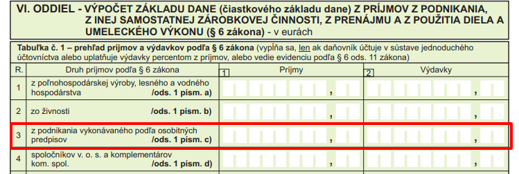 Príjmy podľa osobitného predpisu uvádza daňovník v daňovom priznaní typu B v časti v VI. oddieli v tabuľke č. 1 v riadku č. 3, stĺpci Príjmy.