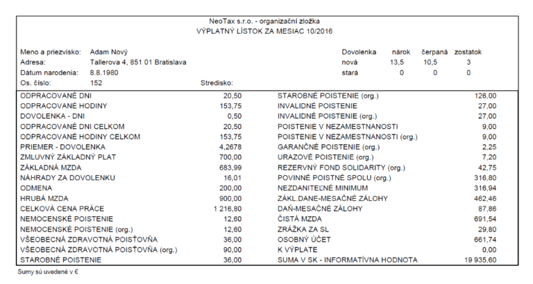 V našom prípade máme k dispozícii výplatnú pásku pána Nového, ktorý pracuje v spoločnosti NeoTax. Výplatná páska je za mesiac október. Pán Nový má evidenčné číslo 152 a je poistený vo Všeobecnej zdravotnej poisťovni.
