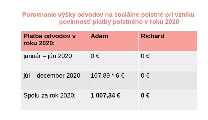 Adamovi vzniká povinnosť platby odvodov na sociálne poistné od 1. júla 2020 vo výške minimálne 167,89 € mesačne. Odvody za júl musí uhradiť do 8. augusta 2020.