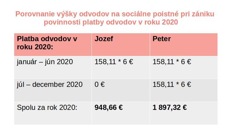 Jozef zarobil za rok 2019 menej ako je limit pre povinnosť platby odvodov. Povinnosť platiť odvody mu zaniká dňom 30. 6. 2020. Od 1. 7. 2020 už nemá povinnosť platby odvodov na sociálne poistné. Poslednú platbu za jún 2020 musí uhradiť do 8. júla 2020.