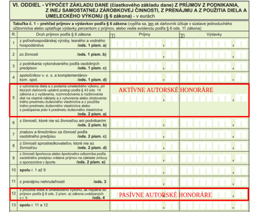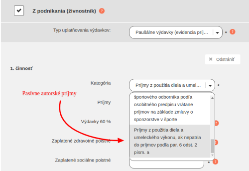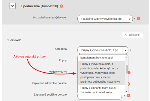 - V kategórii si pre aktívny príjem z autorských honorárov zvolí 4. položku zhora - Príjmy z vytvorenia diela a z podania umeleckého výkonu, pri ktorých daňovník uplatnil postup podľa § 43 ods. 14 zákona a z vydávania, rozmnožovania a rozširovania diel na vlastné náklady a z vytvorenia alebo zhotovenia iného predmetu duševného vlastníctva a z použitia iného predmetu duševného vlastníctva alebo z postúpenia práv k predmetu duševného vlastníctva